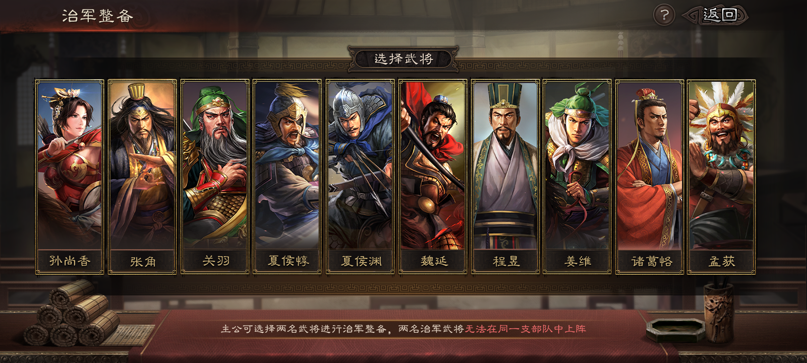 自定武将buff,探索阵容可能性。共有10位熟悉的武将在全新玩法系统“治军整备”中静候选择,主公可任选其二,学习特性获取强力加成塑造出武将新面貌。赛季内可反复更换武将进行体验,冷却CD为2天。