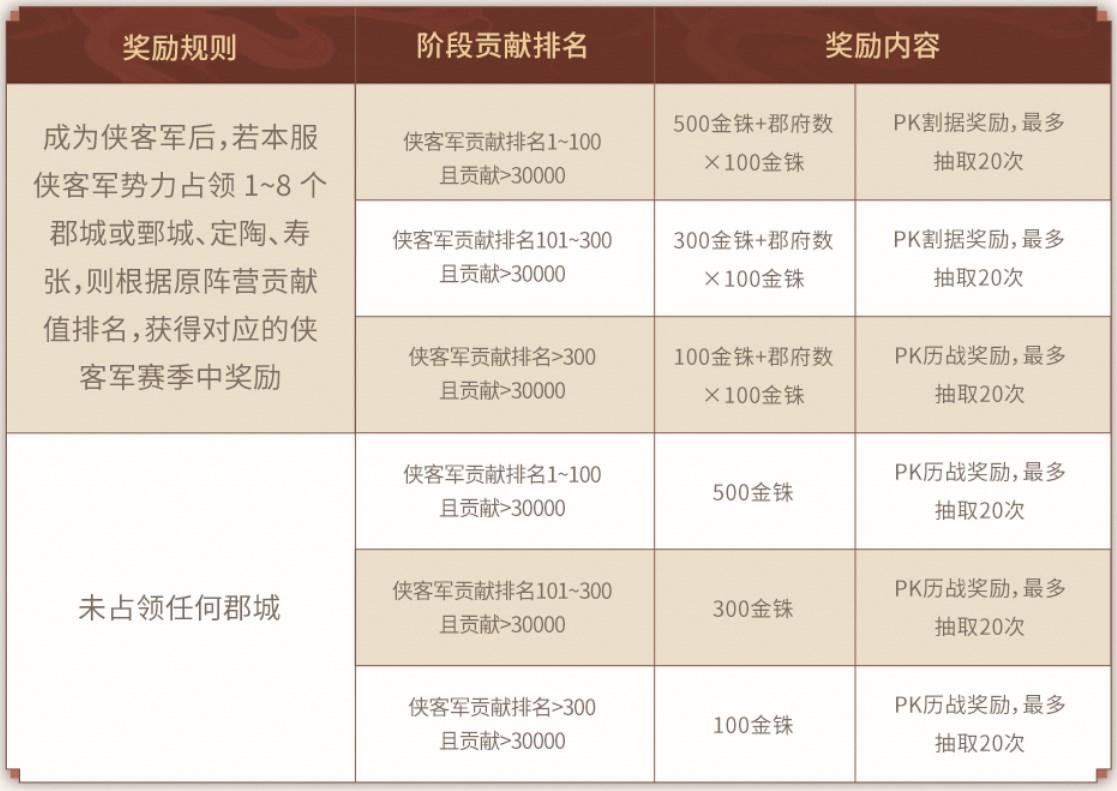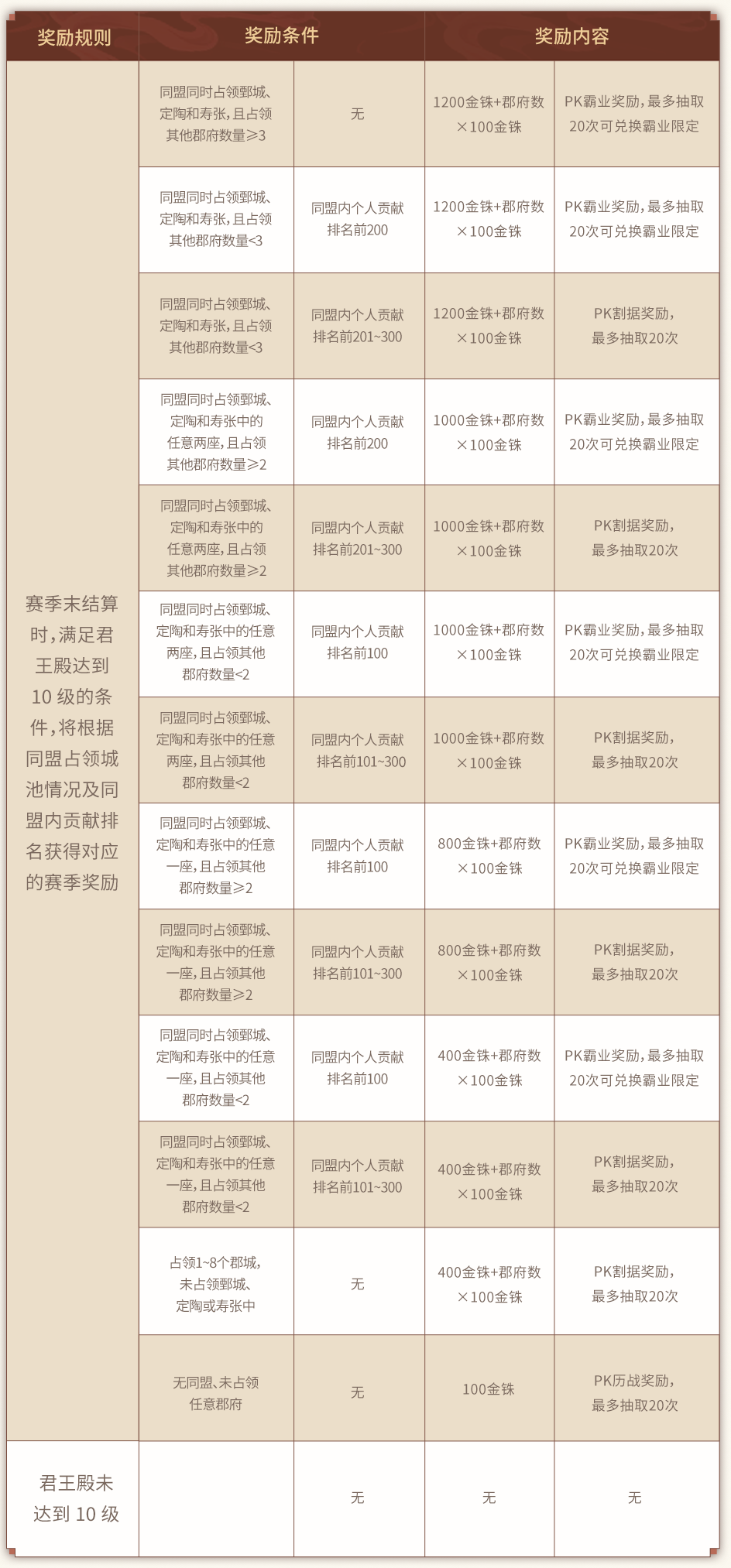 以三霸业州州府占领情况结算赛季奖励。本次新剧本“兖州之战”的结算方式是根据同盟占据霸业州州府(鄄城、定陶、寿张)的数量和同盟内个人贡献排名而定的,最多可三个同盟同时拥有霸业结算奖励。