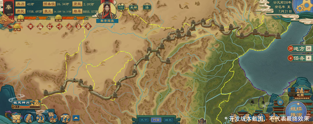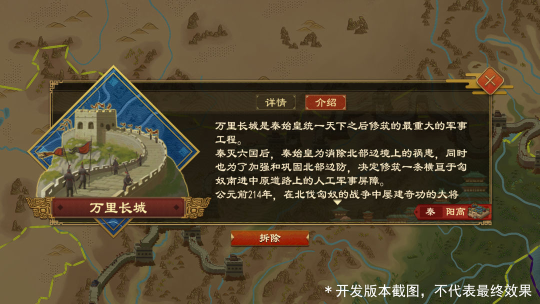 在奇观的功能设计上,除了基础的数值加成外,本次更新引入了更多机制效果。例如大家耳熟能详的长城。作为特殊奇观,长城仅能在鸣沙、灵洲、朐衍等19座城市进行建造。完成所有长城的建造工作后,可以整体升级建造为“万里长城”,待到建造成功后, 地图上的所有长城段落将连接为一条完整的“万里长城”,产生外观以及效果的改变。