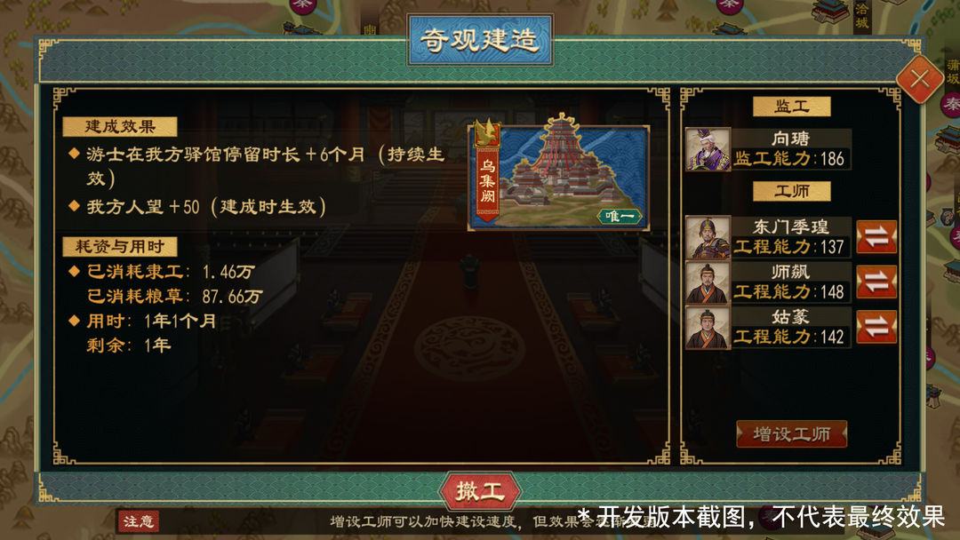 奇观的建造时长和建造成本,将受到城邑工术、监工以及工师的影响。目标城邑的工术越高,代表该城邑工程能力越强,建造奇观的资源成本以及建造时长就越低。在执行建造任务前,君上可以选定合适的朝臣、门客或者宗亲进行监工,人物的工程能力越高同样可以降低奇观的建造成本以及工期。在奇观开始建造一个月后,可以逐步安排墨家人物作为“工师”,对奇观建造进行加速。由于部分奇观是限定局内“唯一建造”,即其他势力和玩家势力有可能出现“争夺建造”的局面,所以如何合理安排奇观的建造工作,将是新版本中重要的一个策略点。