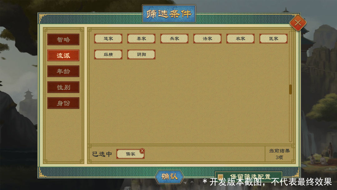 久等了!本次更新对求学功能的操作进行了优化。更新过后,在求学令中可以对学子的智略、流派、年龄、身份等词条进行筛选,可以更便捷地选中目标学子。