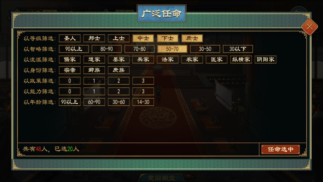 选择好地区后,点击【自动任命】,会出现筛选界面。在此界面可以对都邑大夫候选人物的等级、智略、流派等进行筛选,可以帮助大家更精准地控制委任令的人才范围。