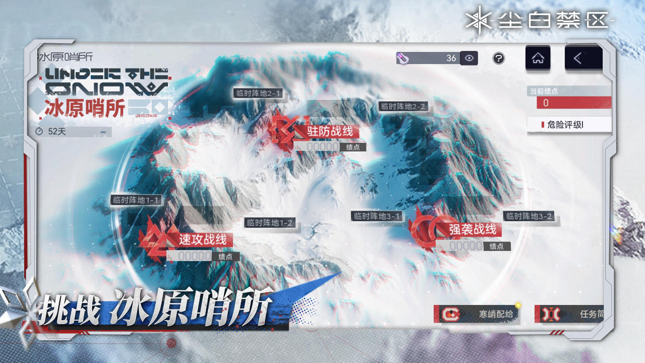 区域探索性清扫行动,分为多种危险评级,每级均有三条战线及若干临时阵地。分析员需要选择合适的队员匹配各战线进行挑战,获取绩点领取奖励。