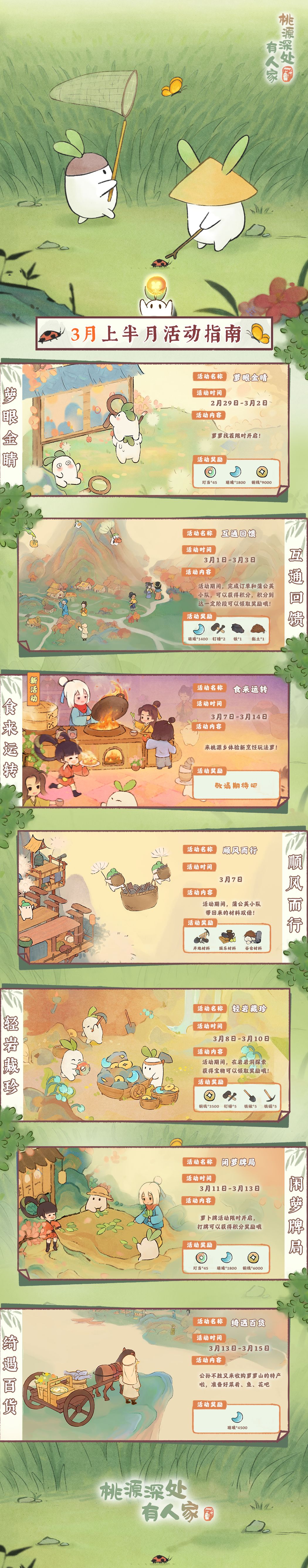 《桃源深处有人家》是一款悠然治愈的国风山水田园经营手游。回到心中的故乡,远离尘世,过一份安静恬淡的小生活。最近的桃源乡正在筹备三月上半月的新活动,小伙伴们可以收藏日历防止错过活动时间哦!
