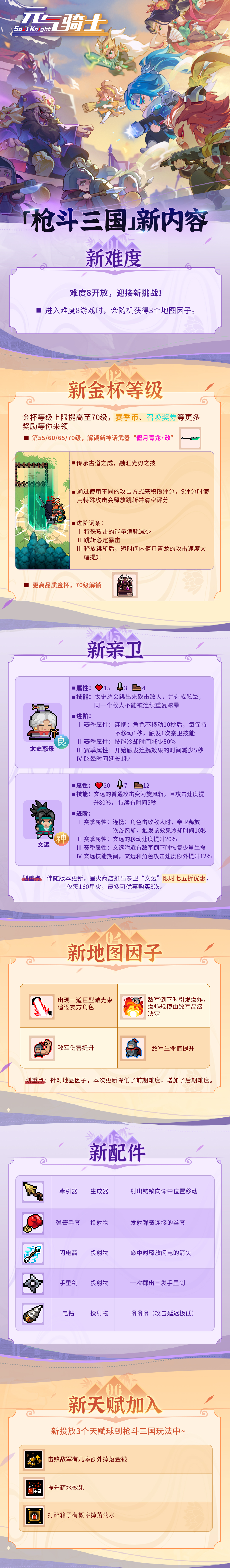 《元气骑士》4月23日新版本v6.2.0更新!这次迎来难度8,随机刷3个地图因子!奖励多多赛季金杯等级提高,新神话武器及更多赛季币等待着各位喔~「枪斗三国」更新详情请看下方长图~
