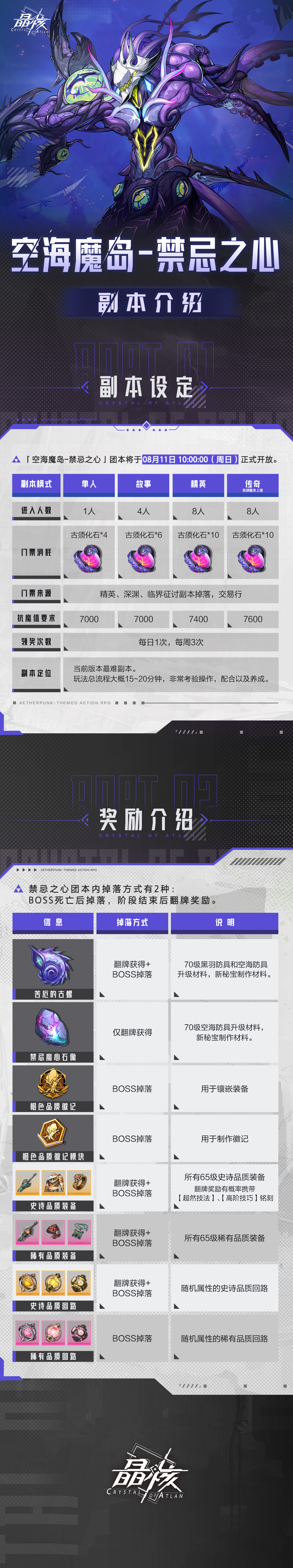 「空海魔岛-禁忌之心」团本将于08月11日 正式开放,包括单人、故事、精英三种模式。通关副本有可能掉落:苦厄的古螺、禁忌魔心石像、橙色品质徽记及模块、65级史诗品质装备等奖励。冒险者们,即刻出战征服「禁忌之心」吧!